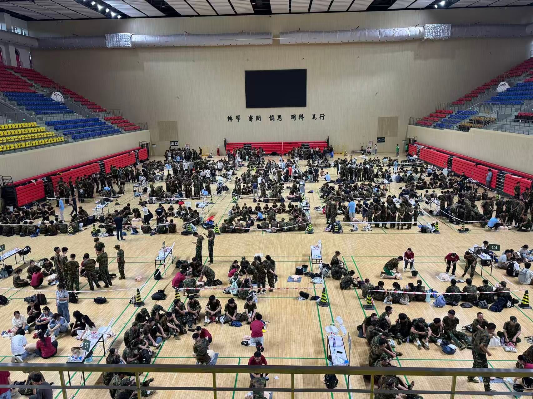 在新体育馆,130多个模拟人、46个AED整齐排列。100余名培训教官们分成46组,对新生们一一进行手把手教学。在医护人员的指导下,学生们认真学习:从判断患者意识、呼叫急救人员,到找准按压位置、控制按压频率与深度,再到进行人工呼吸,一丝不苟地反复练习,全神贯注地投入,力求将每个动作都做到标准规范;从初次接触AED的敬畏到熟练使用,开机、贴电极、听指令、放电,全程遵循语音指导。
