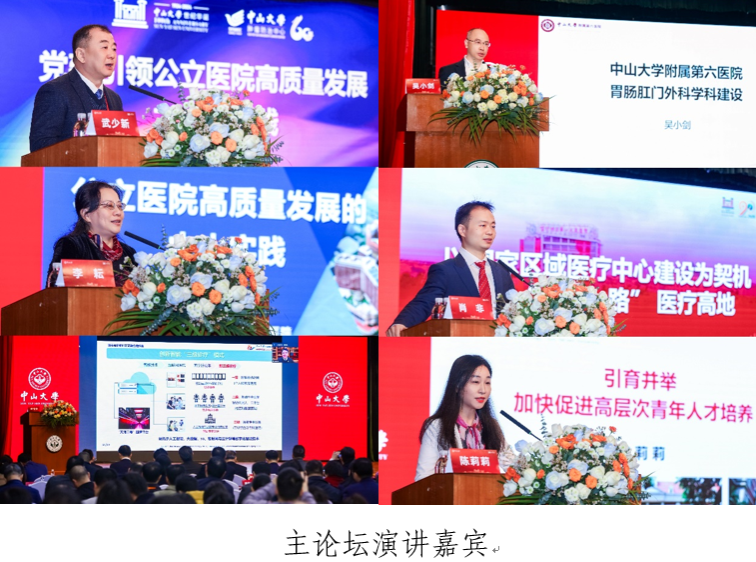 论坛主题报告环节邀请了中山大学肿瘤防治中心党委书记武少新、复旦大学附属中山医院党委副书记李耘、中山大学中山眼科中心院长林浩添、中山大学附属第六医院院长吴小剑、中山大学附属医院喀什医院院长肖非、中山大学附属口腔医院院长陈莉莉分别围绕“党建引领公立医院高质量发展”、“学科融合与医工交叉”、“学科建设”、“国家区域医疗中心建设与医疗帮扶”、“高层次青年人才培养”的主题分享了各家医院的特色做法与服务健康中国建设的突出成效,展现了中大医科在服务人民生命健康方面的贡献,交流了医疗界同行在医院高质量发展中的经验做法。